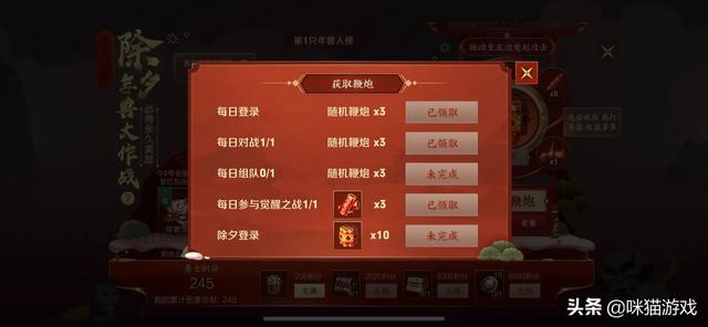 首先,我们可以看到上图当中的年兽大作,主要就是收集一些鞭炮,然后合成相应的道具就可以很轻松的去兑换你们想要的年兽宝藏啦。