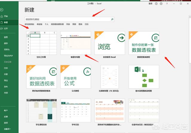 然后进入我们现在这个界面如果是想自己编辑就点空白工作薄,如果想用快捷模版可以用示例的几个,这里面如果都不满足,就在"搜索联机模版"输入你想要的模版,马上就可以直接应用了