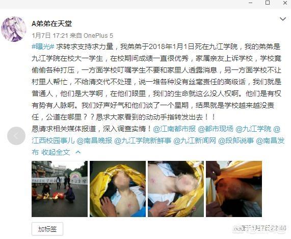 一姐姐在微博发声,说弟弟元旦凌晨在九江学院坠楼身亡,学校认定自杀,家属与学校协商未果。