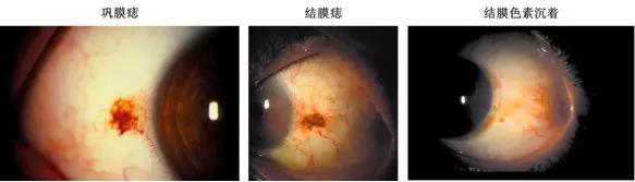 52%人群有巩膜痣(下图左),只是良性的色素沉着,青年时期就有了。良性的结膜痣(下图中),可以是先天性的,出生时就有,或者6个月以后出现,也有后天获得的。有碍美观的结膜痣可以手术切除的。或者非裔和我们亚裔常见的结膜色素沉着(下图右),这是种族特有的黑素沉着。