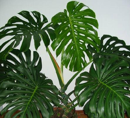 1.龟背竹:龟背竹叶厚革质,互生,暗绿色或绿色;幼叶心脏形,没有穿孔,长大后叶呈矩圆形,具不规则羽状深裂,自叶缘至叶脉附近孔裂,如龟甲图案,在浓绿色的叶片上带有大面积不规则的白斑,十分美丽。
