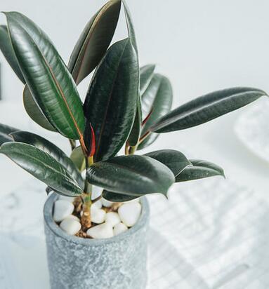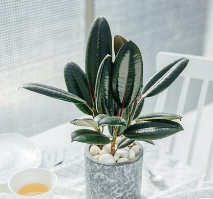 2.橡皮树:常绿木本观叶植物。橡皮树叶片较大,厚革质,有光泽,具有美丽的色斑,树形丰茂而端庄。橡皮树观赏价值较高,是著名的盆栽观叶植物。橡皮树虽喜阳但又耐阴,对光线的适应性强,所以极适合室内美化布置。