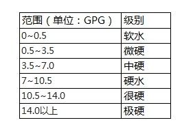 按中国目前的情况,大部分地区的生活用水为各自来水厂净化处理后的自来水,硬度范围为8 ~ 14 GPG ,属于硬或很硬范围。(使用井水的地区硬度更高,达到极硬范围)。