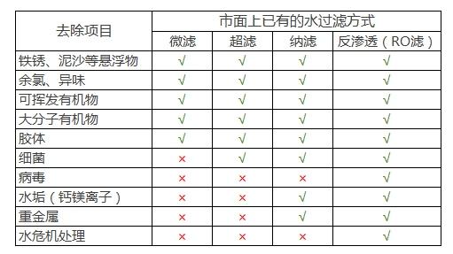 市场上常见的水过滤方式有 微滤、超滤、纳滤和 RO,对应自来水里可能含有的以下物质,过滤能力如下表: