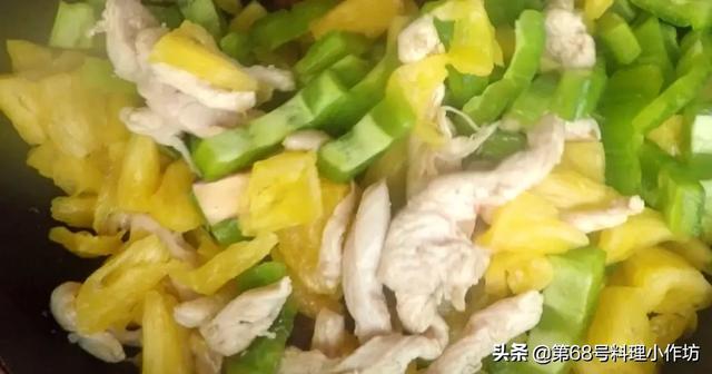 倒入绿油油的苦瓜和黄澄澄的菠萝,一起炒,如果能炒出一点香味(或者苦味)更好,完了加点盐调味
