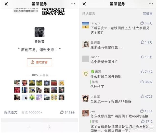 文章中,警务君言简意赅地介绍了视频报警的优势,在这个号称“最有态度的警察原创号”下,文章点赞已逼近10万。