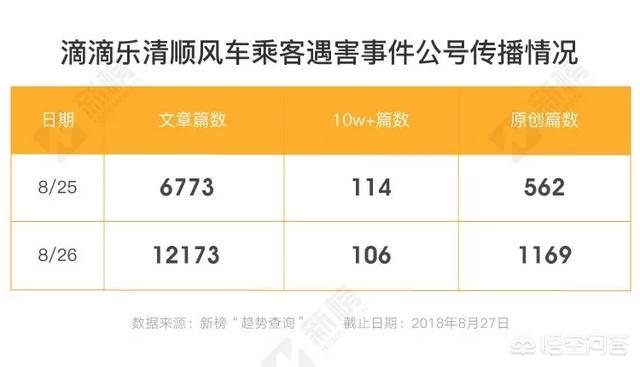 而在微信公众号平台,在新榜日常连续监测的63万微信公众号中,过去两天,共有超过1.89万篇文章写到滴滴事件,这其中,有1731篇原创内容,共诞生了220篇10w+爆文。