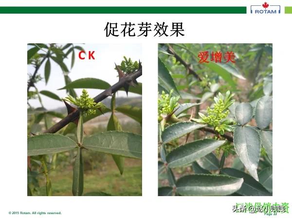 花椒的花芽分化分为生理分化和形态分化,生理分化期时间较长,主要发生在花椒收老阶段,形态分化期主要是在春前春后,那么醒苞药也就是在形态分化期打,能起到花芽分化稳定,花苞饱满,养分补充等作用,花芽分化的好坏取决于植物体内的五大内源激素,分别是生长素,乙烯,细胞分裂素,赤霉素,脱落酸,如果这五大内源激素失去平衡,就会出现花芽畸形,及大叶子等问题,所以打醒苞药是很有必要的,那么为什么市场上的醒苞药都会加芸苔素,主要目的就是起到调节平衡,但普通芸苔素的持效期只有五天左右,无法一直保持平衡,而花芽分化是一直在进行,所以很多人会反应醒苞药打了和没打区别不大,因为普通芸苔素不能做到持续平衡,知道这个原因后,我自己家里面的花椒就一直用的是龙灯公司的芸苔素,这些年花椒产量一直很稳定,也没有大叶子病,这种芸苔素跟普通芸苔素的区别是持效期可以达到25天,只要在春前,春后,保花,保果加起打,就可以起到醒苞,拉长花絮,减少生理落果等效果。下面就直接看图: