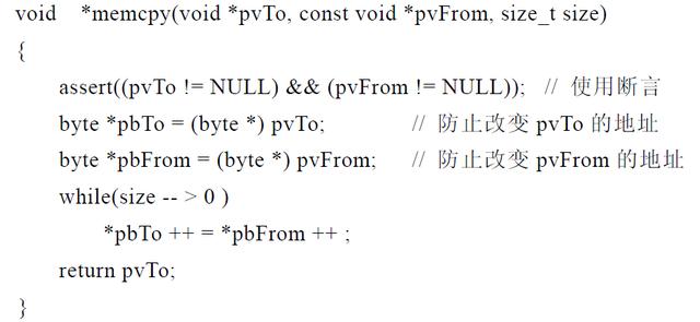 2.出错处理:出错处理是考验程序健壮性的标准之一。比如,参数中有指针,用该指针之前就需要判断是否为空;空间申请有始有终,有Malloc就要有free;try catch finally的合理使用等等。如下Memcpy函数的实现: