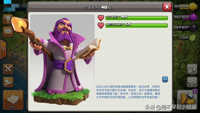 这和你的英雄等级有关,等级越高加的就越多,就拿20级大贤者来说吧,提升友军最大生命值50.0% 上限275血,也就是说最多加275血。满级巨人的生命值是1260,1260*百分之50=630,因为有上限的关系所以就加275。