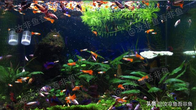 可能会有很多人不认为这个观点,刚好也有一个50的缸,里边大约有100+的鱼,以泰国斗鱼和孔雀鱼为主,这样的饲养密度不算小,可也没有全天开水泵过滤,如下图: