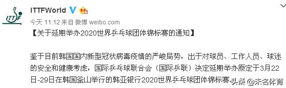鉴于目前韩国国内新型冠状病毒疫情的严峻局势,处于对球员、工作人员、球迷的安全和健康考虑,国际乒乓球联合会(国际乒联)决定延期举办原定于3月22-29日在韩国釜山举行的韩亚银行2020世界乒乓球团体锦标赛。