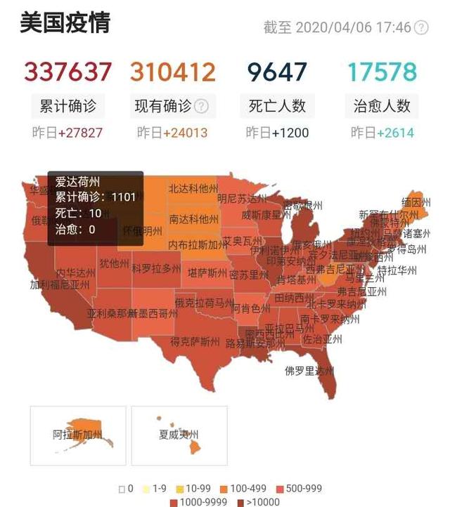 其中纽约州46097人确诊,占全美37.11%,新泽西州确诊8825人,占比44.21%,两个州合计占全美44.21%,无疑是美国的重灾区。