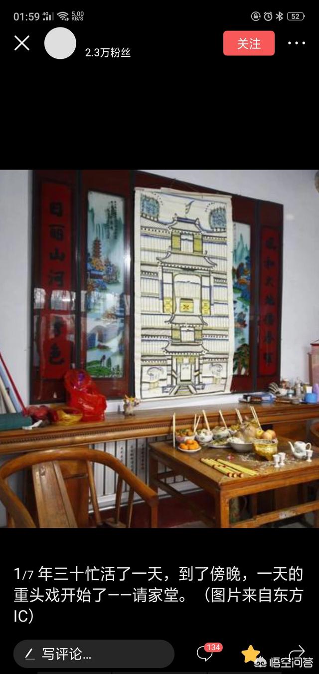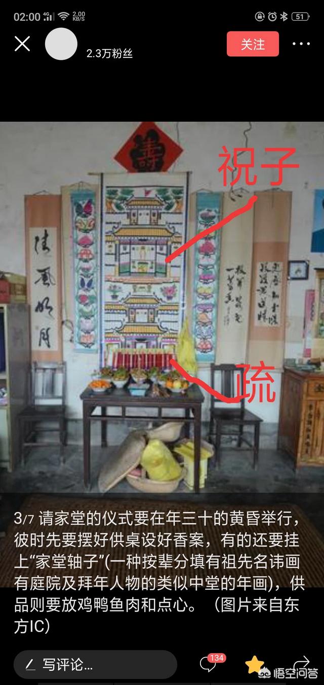 首先说明一下,题问中所说的不是族谱是“ 祝子 ”,上面记录着先辈的名字,一般上推到30辈(辈,也称世,代。)左右。这祝子一般是除夕下午,才可以悬挂在正屋的正北墙上。一般家庭正屋的正北都放置一个长条的木桌,也有用土墼(ji)或砖砌成,我们这边称为“ 福桌 ”。挂好祝子后,再在福桌上摆好“ 疏 ”,疏,由白纸粘成,信封大小,正面附一溜红纸,红纸上写着-.- 先祖xxx之神位,上推三代,每位先祖一个疏,也就是每人一个牌位,再在牌位前面摆放一双筷子和酒杯等餐具,每位先祖一套餐具。再在福桌上摆香炉蜡烛及贡品,贡品中鸡鱼猪头必须有,其他好吃的也要摆上,越多越好。