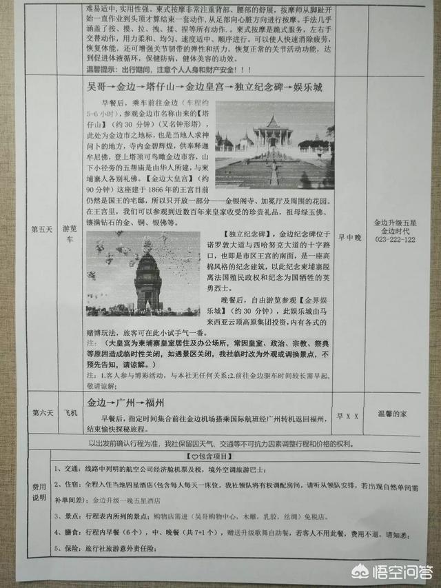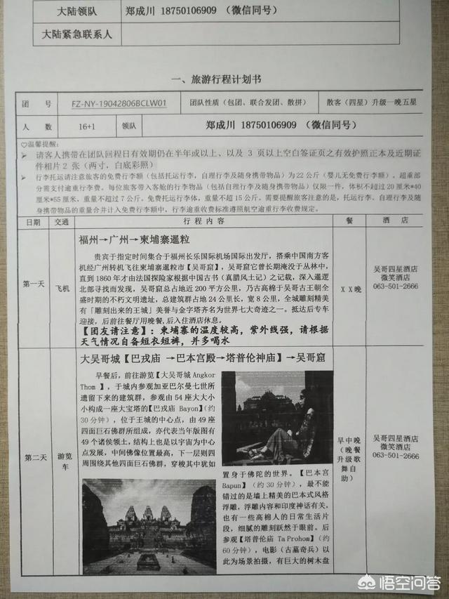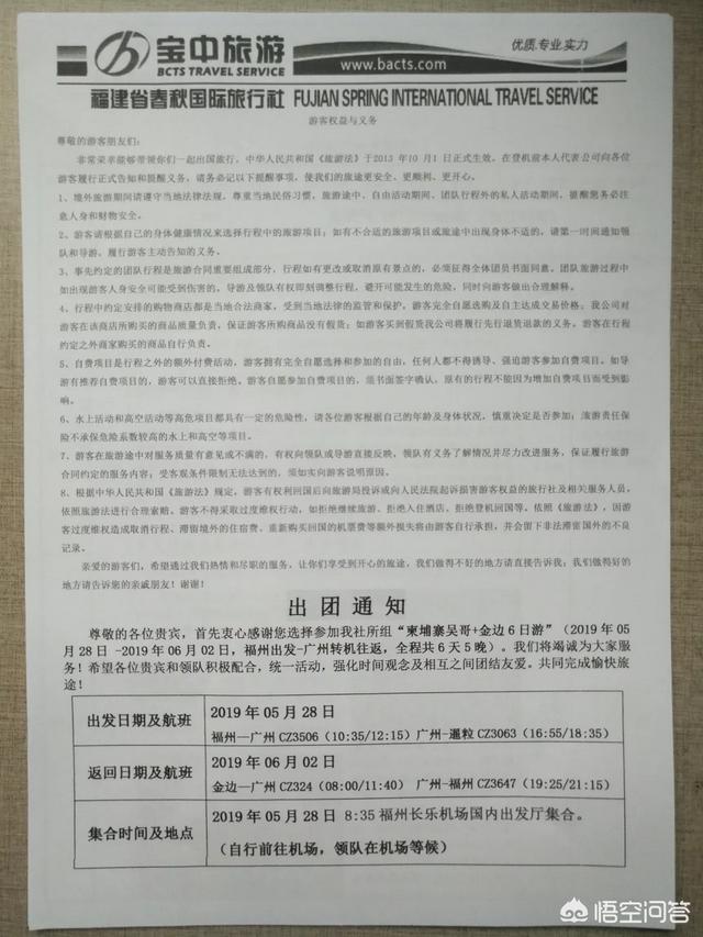 一、报名阶段。报名时除了选择您要的出境目的国,您要的线路,可以多了解一些这趟出行的基本信息。一般给您的旅游规划书就非常详细,尤其是出发前几天再给的《出团通知书》,里头包含了各种出行基本信息:您出发前需要准备的服装、装备等物料信息,比如:服装夏装,可带泳衣泳裤,墨镜防晒,整肠丸花露水驱蚊水酌情携带等等;全程陪同领队的联系方式,集合时间与地点;整个行程的行程安排;进出海关的注意事项;目的国的风俗禁忌等等,这些内容在出发前仔细看一遍,就能让您对出境游有起码五成了解。接待您报名参加旅游的工作人员对你整个旅游负责,从你的咨询、报名、准备、旅游、回程,任何问题都可以跟她沟通,因为您是她的上帝!