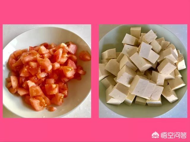 1、准备好豆腐切小块,开水过下(防止豆腐在翻炒是碎掉),西红柿切块。