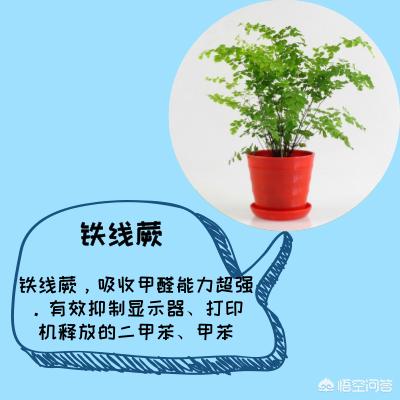 铁线蕨每小时能吸收大约20微克的甲醛,所以成天与油漆、涂料打交道的人,或者身边有喜欢吸烟的人,应该在工作场所放置少一盆蕨类植物。另外,铁线蕨还可以抑制电脑显示器和打印机中释放出来的二甲苯和甲苯。