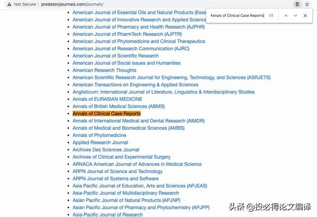 小Tips:按“ctrl+F”,输入期刊名,即可查询目标期刊是否被列入“掠夺性期刊”列表。