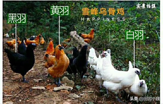 雪峰乌骨鸡,有白羽、黑羽、黄羽。