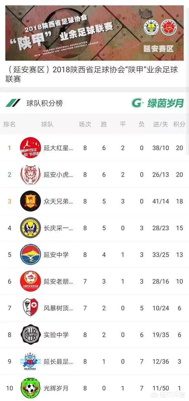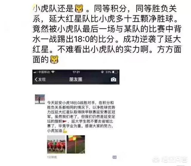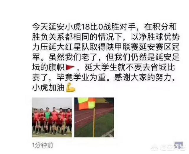 在最近结束的陕甲业余足球联赛延安赛区的比赛中,出现了那么一场比赛比分高达18-0,延安小虎队通过这样一个比分,通过总进球的多两个的优势反超原先的榜首球队延大红星队!成功夺冠!