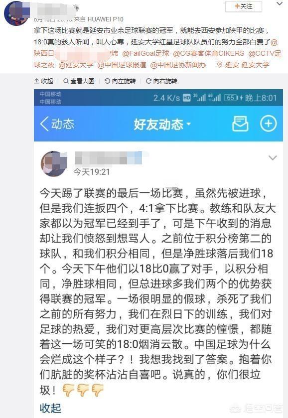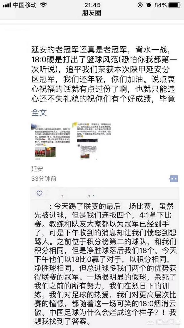 至于最后一轮比赛在第一名踢出4-1的情况下,延安小虎队以18-0的比赛结束战斗未免太过巧合,不多不少刚好抹平第一名的净胜球差距,而在总进球数上有超过延大红星队两球,这个说是“意外”怕是难以服众吧!突然想起来当然国足一群大佬在那算进香港7个球铁定出线……似乎有着差不多的样子。