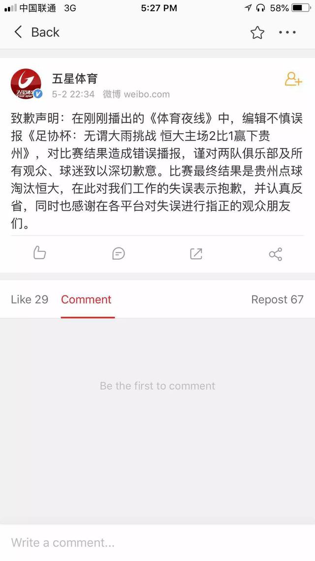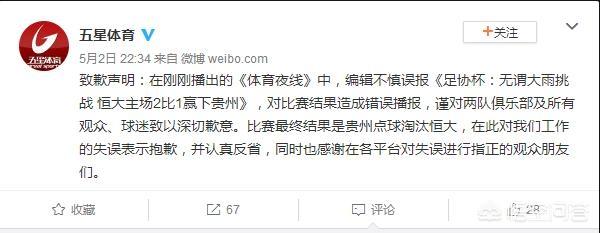 现在是网络时代,出现这种误报实在不应该,我们都知道当时的比赛是2:2,他们说成了2:1,新闻要真实的报道,比赛还没有结束,说就晋级了呢?希望通过,五星体育,向全国球迷言明,给双方球队道歉。今后使新闻工作步入正规的航道。恒大,给全国球迷来了个冷门,五星体育,给全国球迷,来了个乌龙。