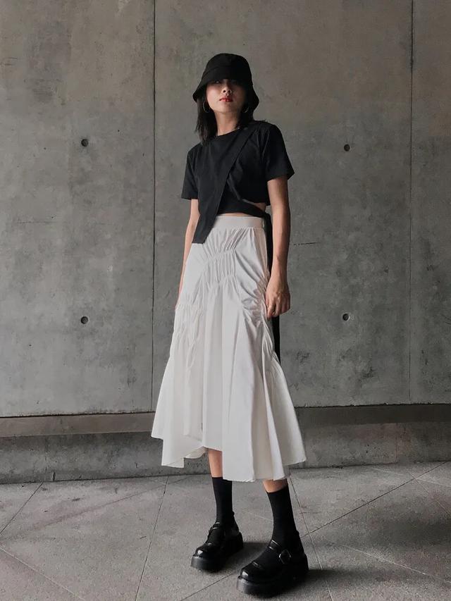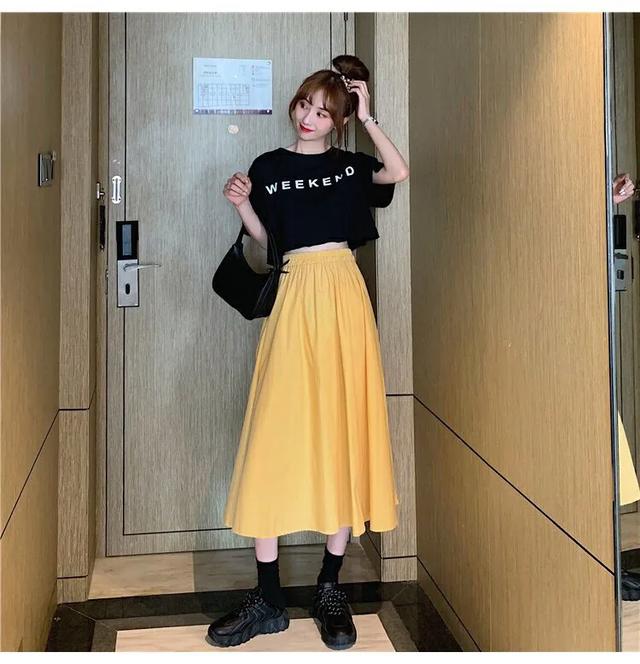 高腰的伞裙也是可以选择的单品,上面可以搭配简单的T恤,高腰伞裙也可以扬长避短。