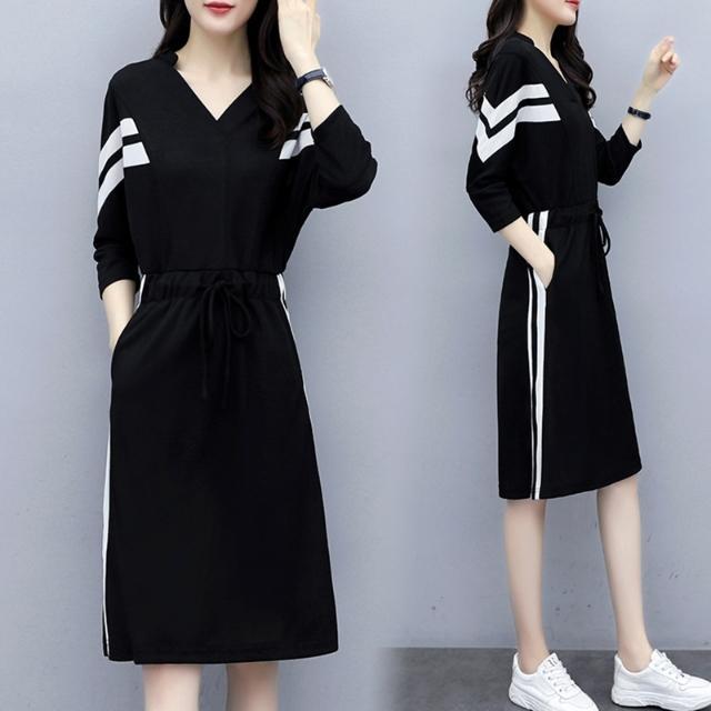 第二就是休闲的运动连衣裙,裙子的鸡心领,感觉颈部特别的长,无形中就显瘦了,还有腰部的,腰线轻轻一束也不要束太紧,非常显瘦,裙子两边的白条条更能把人的身材显得苗条。