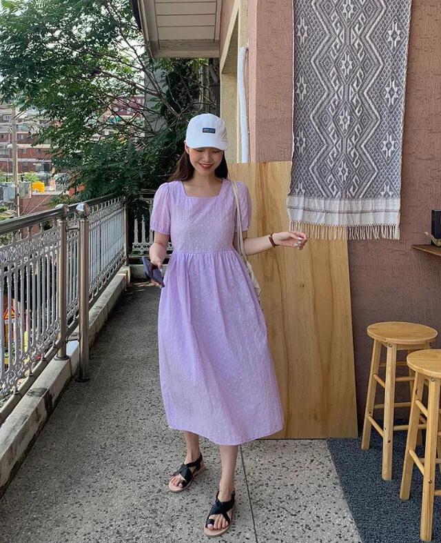 可以选择这种相对来说比较宽松的连衣裙,腰线最好高一点,裙摆大一点,会突出你腰细的优点,大大的裙摆会很好的遮住你的胯部。