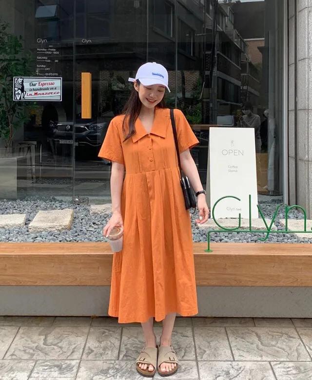 今年流行的这种翻领连衣裙也是比较的合适的,翻领还可以弱化胸部大的特点。