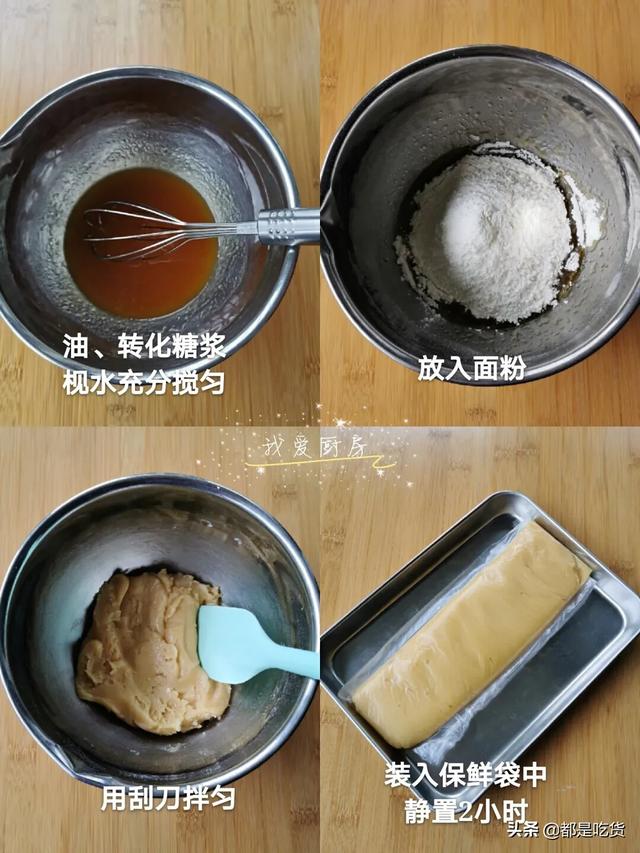 第一步,转化糖浆,油,碱水调匀,倒入面粉中,和成面团。