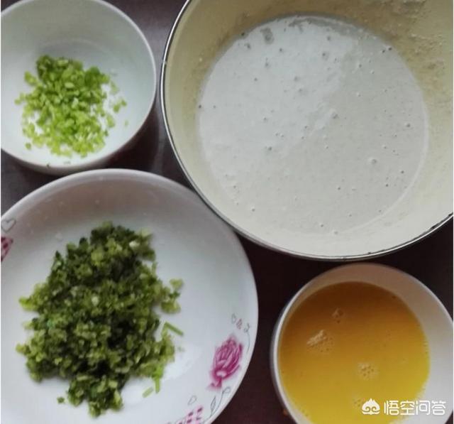 生菜和葱分别切碎,鸡蛋打成蛋液拌匀,荞麦粉加适量的水搅匀(放置几分钟,使其充分与水溶合,不要有粉团)。