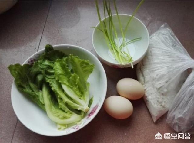 准备食材:洗净的生菜、葱,鸡蛋2个,荞麦粉