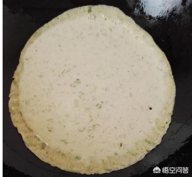5、热一口平底锅,倒一丢丢油,其实不倒也行,只要锅的热度够,是不会糊锅的。 6、倒入50ml左右的面糊,摇均匀,中小火烤着,等面饼的边边翘起来就可以把饼直接拿出来。煎第二张面饼开始就不需要倒油,直接倒面糊就可以。