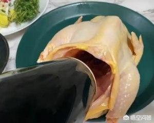 然后鸡肚子塞满自己喜欢的配菜,西芹,甜豆,冬菇,金针菇等最后把鸡肚子缝合起来,涂两三遍酱汁边涂边按摩,留三分之一酱汁后面用