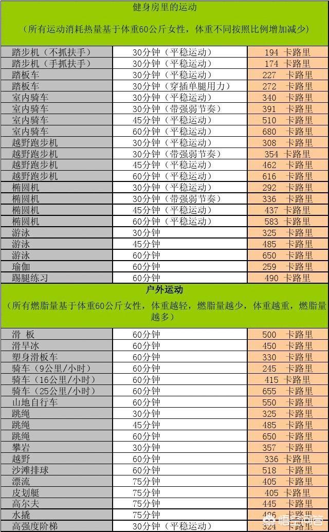 第三,你不想长肌肉,瘦身。可以控制饮食+有氧运动,不做力量训练。控制饮食+有氧运动每天的能量赤字控制在500~600大卡左右,这样可以让你以每周一斤的速度健康减脂。饮食上面可以减少300大卡左右碳水和脂肪的摄入,再加上每天300大卡的有氧运动能量消耗,下图附上常见食物能量和一般有氧运动能量消耗。