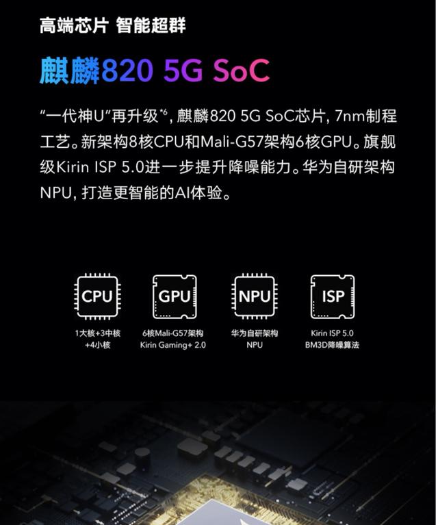 荣耀30s作为荣耀今年的中端机型,搭载的是华为今年的开门红麒麟820 5G,这颗中端处理器继承了去年荣耀9x上那颗高性能高性价比的麒麟810的优点,这次不仅支持5g,在性能上有了大幅提升(安兔兔22万→40万)同样也是7nm制程。