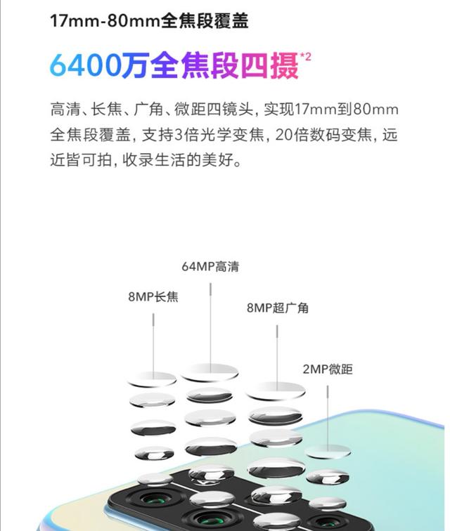 荣耀30s在相机上并没有因为定位中端而缩水太多,搭载的是20年主流的6400万imx686主摄,配合800万的超广,800万的长焦,200万的微距。也实现了17-80mm焦段的全覆盖。遗憾的是,数码变焦最高20倍,而荣耀20pro是30倍。