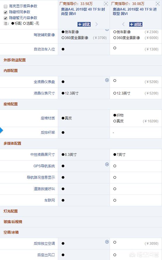 以2019款A4L为例,40进取官方售价30.08万,40时尚33.58万,两者在动力上没有区别,都是2.0T190马力,匹配7速双离合。外观上几乎没有差异,只有轮毂样式和轮胎规格不同。区别主要在内饰和舒适性配置上。