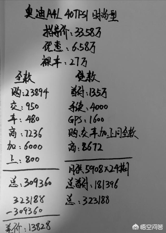 如果是贷款买车的话,首付一半贷款一半,手续费4000块,GPS费用1600块,购置税,交强险,车船税,装潢,上牌费和全款买都是一样的。商业保险多了盗抢险和涉水险等险种,共计8672元。月供5908元分两年还清,总首付18万出头,总落地价323188元。全款和贷款买差价13828元。但是全款买的话什么都不送,贷款买的话送刀锋轮毂和无钥匙进入,以及四次基础保养。对比了一下,没有抵挡住这赠品诱惑,最终还是选择了贷款。因为光加装刀锋轮毂和无钥匙进入就已经接近1万了,贷款买车还能暂时缓解一点压力,所以只能这样。