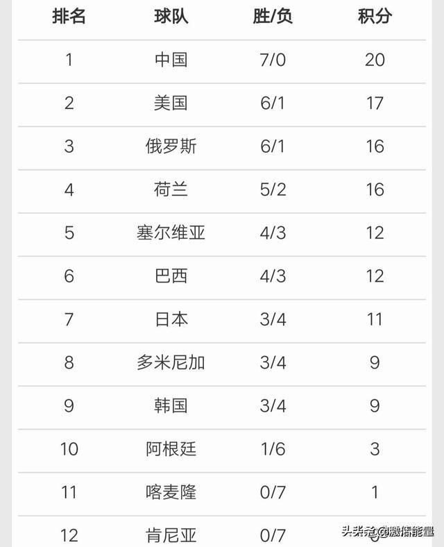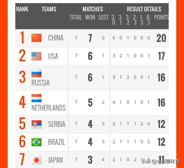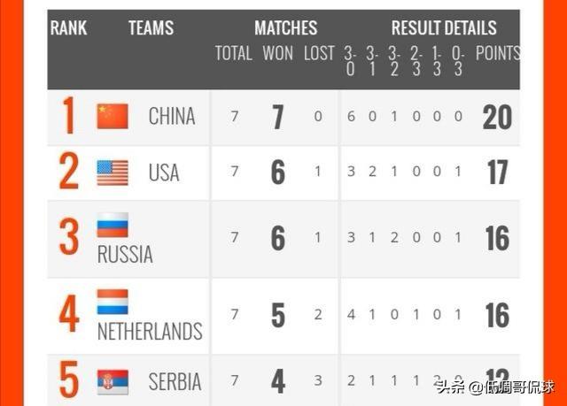 以下是具体的排名情况:中国女排以7胜0负排名第一,美国女排以6胜1负排名第二,俄罗斯女排以6胜1负排名第三,荷兰女排以5胜2负排名第四,理论上也只有美国女排、俄罗斯女排、荷兰女排能够与中国女排竞争冠军奖杯!而