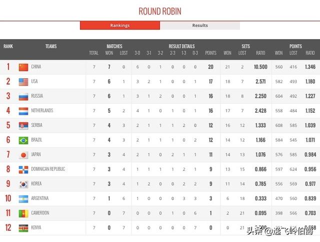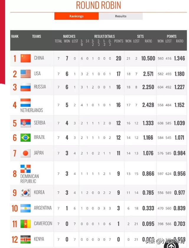 中国女排7连胜,积20分。排在第一;第2名,美国女排6胜1负,17分;俄罗斯女排