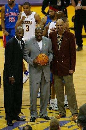 湖人80年代三巨头。魔术师约翰逊,天勾贾巴尔,詹姆斯沃西,史上最强控球后卫+超级中锋+名人堂小前锋,联手打出八十年代最华丽的showtime。