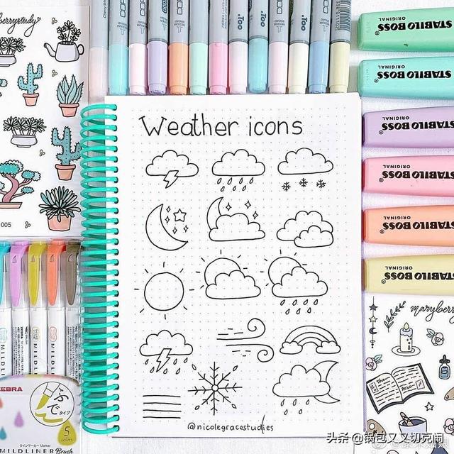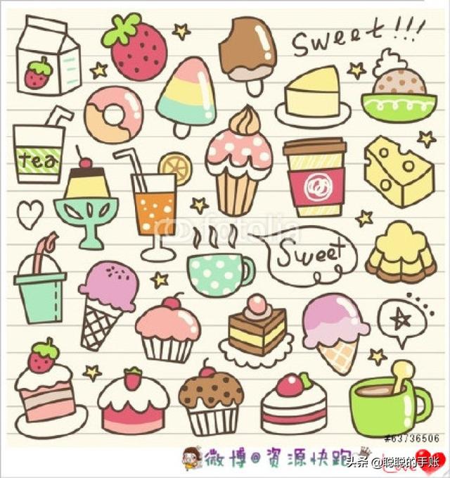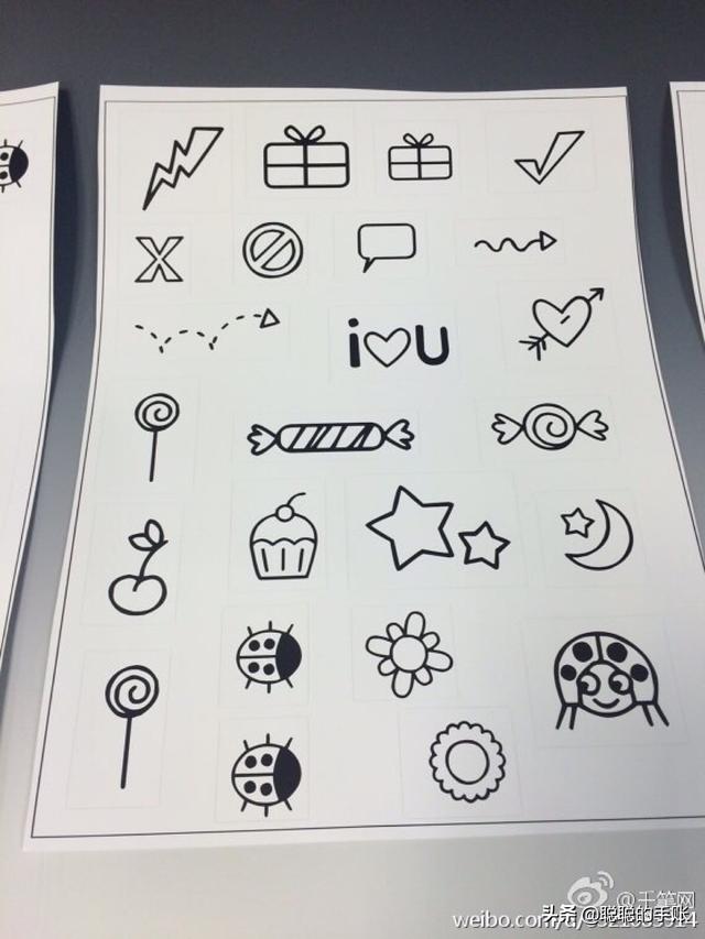 微博上有很多手帐素材图片,搜索一下,保存在手机里,就可以照着画啦!我自己就保存了很多图片在手机里!可以参考一下!