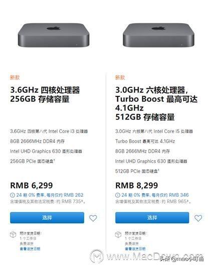 新款Mac mini官方标配有两个版本,i3/8GB/256GB 6299元、i5/8GB/512GB 8299元。至于其它配置方面,目前尚未发现有更新的信息。