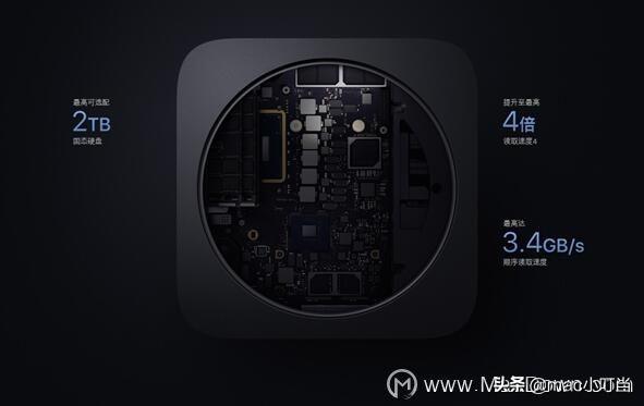 这一代Mac Mini的外观和内部设计、整体配置几乎都没有变化,目前看升级的就是SSD固态硬盘,标配容量从128GB、256GB分别翻番至256GB、512GB,另可选1TB、2TB,标称持续读取速度可达3.4GB/s。