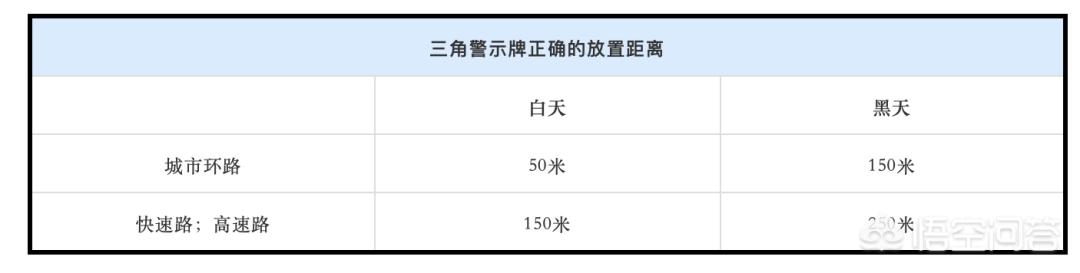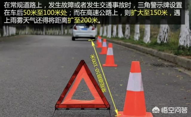 而在高速公路上,则要在车后150米外的地方设置警示标志,若遇上雨雾天气,还得将距离提升到200米。