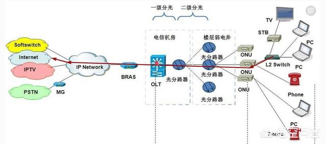 现在我们的宽带,其实也是共享宽带,运营商从OLT一根光纤,要经过一级、二级分光才能到用户的光猫,用户的光猫还不单单是宽带,还有IPTV。而如果运营商在某区域发展的用户比较多,分光比太大的话,就可能在晚上用户都上网、都看电视的时候,上网速度就受到影响。