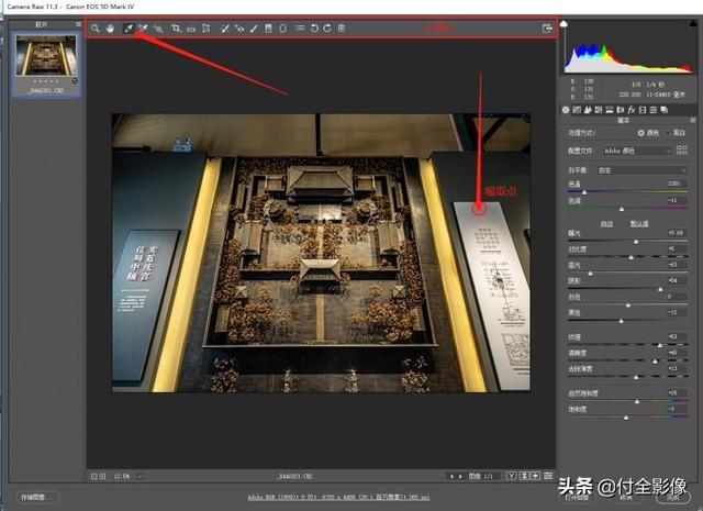 b、在ACR上边的工具栏里找到第三个“白平衡工具”在图片中找到黑、白、灰的任何一点在上面点击,白平衡就矫正好了 又快有方便。
