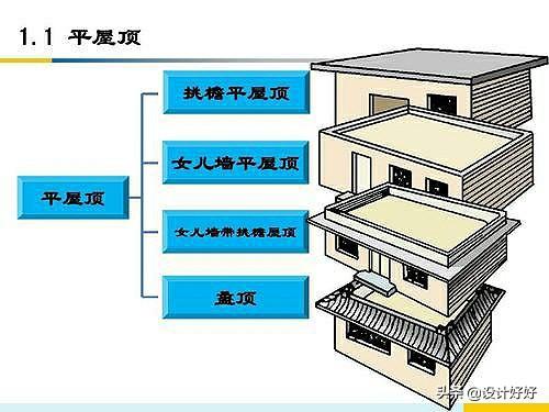 常见的平屋顶有挑檐平屋顶,女儿墙平屋顶,女儿墙带挑檐屋顶,盝(lu)顶。从上面的图片上看属于中国古建筑的盝顶。
